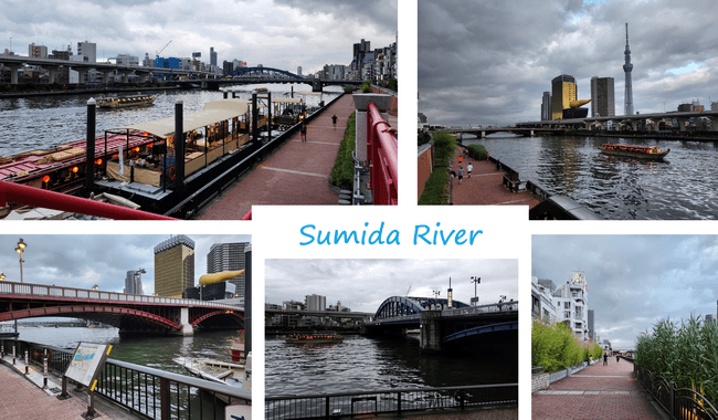 With its 27 kilometers in length, the river banks are connected at least 37 times by bridges of different shapes. The relatively narrow river passes through Asakusa and Odaiba before reaching Tokyo Bay.